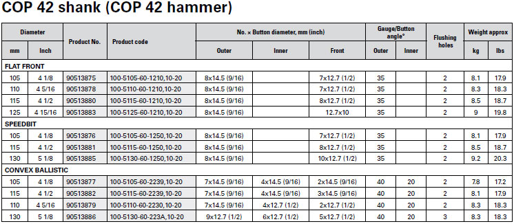 In hard and abrasive formations, however, the flat front design offers best bit life, having strong gauge rows with large spherical buttons which are easy to regrind and maintain. The SpeedBit offers improved productivity with the same gauge as the Flat front, but with ballistic buttons in the front for faster penetration. An alternative is the Concave design with spherical buttons.