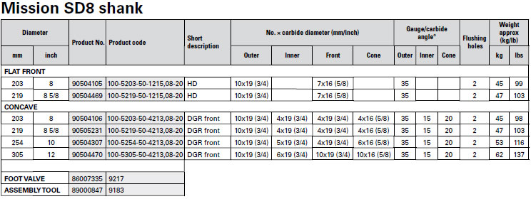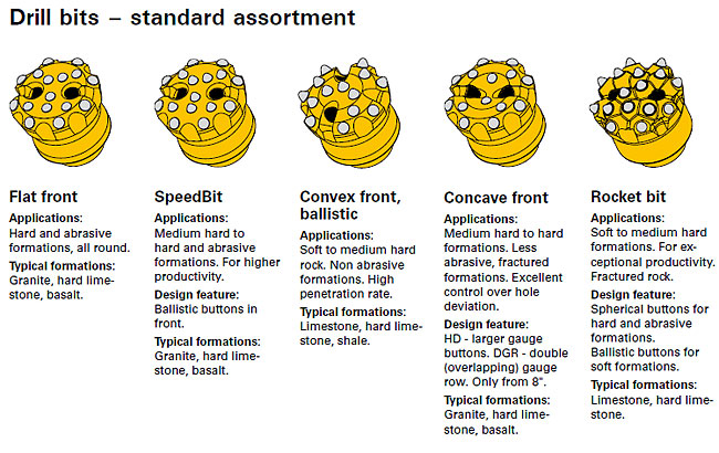 Five basic designs are available: Convex, Flat front, SpeedBit, Concave, and Rocket bit. These are designed for specific applications for all rock types, hardness’s and conditions